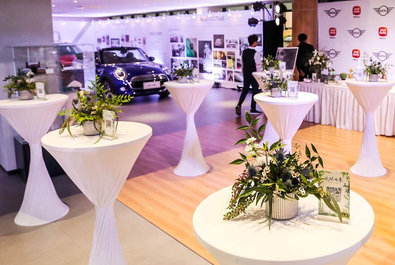 展覽會場插花布置的形式以低矮、匍匐形、宜四面觀賞的西方式插花為主,在沙發轉角處或靠墻處茶幾上也可用東方式插花。
